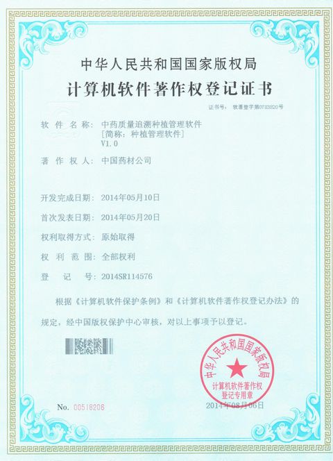 由公司药材溯源项目办公室组织申请的“中药质量追溯种植管理软件”于8月18日获得“中华人民共和国国家版权局计算机软件著作权登记证书”。