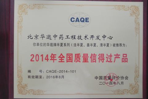 中药华邈应邀参加了论坛,并且凭借着原料道地、生产工艺先进、质量合格的华邈牌半夏系列产品(清半夏、法半夏、姜半夏)荣获了“2014年全国质量信得过产品”称号。这次评选本着优中选优的原则,综合各产品在全国范围内的影响力、产品的质量做出的满意度评比。此奖项是中药华邈继荣获 “2012年度质量管理工作先进单位”、 “2012年全国医药行业质量安全双优企业”、“2014年全国质量信得过单位”等多项质量荣誉后又一个重要奖项。