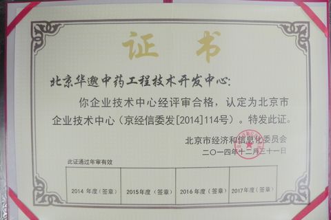 2014年,中药华邈为促进以企业为主体的创新体系建设,提升企业技术创新能力,依据《北京市认定企业技术中心管理办法》向北京市经济和信息化委员会申报了企业技术中心。经过专家及北京市企业技术中心认定指导小组近两个月的审定,考察了中药华邈的综合实力、技术创新体系建设与运行机制、技术中心基本条件、技术创新活动成果等,认定中药华邈为企业技术中心,要求依据相关政策开展工作。