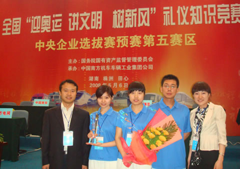 5月6日,在湖南株洲举行的全国“迎奥运讲文明树新风”礼仪知识竞赛中央企业选拔赛预赛第五赛区的比赛中,代表中国医药集团出赛的中国药材王欢、张帅和魏博三位选手,凭借赛前的充分准备和场上的出色发挥,获得第三名的优异成绩。