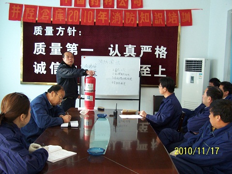 为进一步强化职工消防安全意识,普及消防知识,提高仓库全体人员对火灾等突发事件的防范、应变及救灾能力,锻炼救灾协调、配合能力,积累实战经验,确保仓储安全, 井陉仓库于11月中旬在全库人员范围内组织了消防知识培训和消防演习活动。