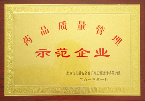 近日,中国药材公司收到北京市药品安全百千万工程建设领导小组授予的“药品质量管理示范企业”荣誉匾额。