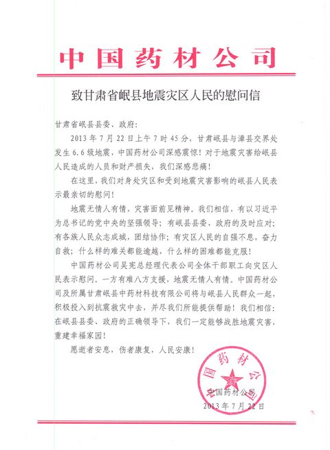 7月22日,甘肃岷县、漳县交界处发生6.6级强烈地震,给人民生命财产造成比较严重的伤亡和损失。听闻此消息,集团和公司领导第一时间向定西仓库以及刚刚并购的甘肃岷县中药材科技有限公司打去电话,详细询问情况,部署相关工作,预防次生灾害发生,确保人员和财产安全。灾情发生当日,吴宪总经理代表公司全体干部职工向岷县县委、县政府发去慰问信,对地震灾害给岷县人民造成的损失深感悲痛,对身处灾区和受到地震灾害影响的岷县人民表示亲切慰问。